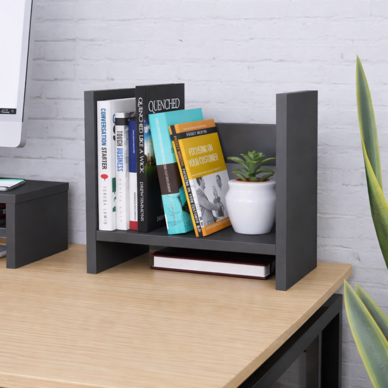 Надставка для письмового столу NS-8 UkrLoft від компанії UkrLoft - практичне та мінімалістичне рішення для декорації та організації вашого робочого столу. У надставку можуть поміститися папки, книги чи навіть декоративні елементи вашої робочої зони. Внизу надставки є скрізне місце заввишки 50 мм, через яке можна вивести зарядні пристрої. Матеріал виготовлення - ламіноване ДСП у кольорі Антрацит завтовшки 16 мм, краї вкриті кромкою 2 мм. Ця надставка чудово комбінується з надставкою під монітор NS-7 від компанії UkrLoft.