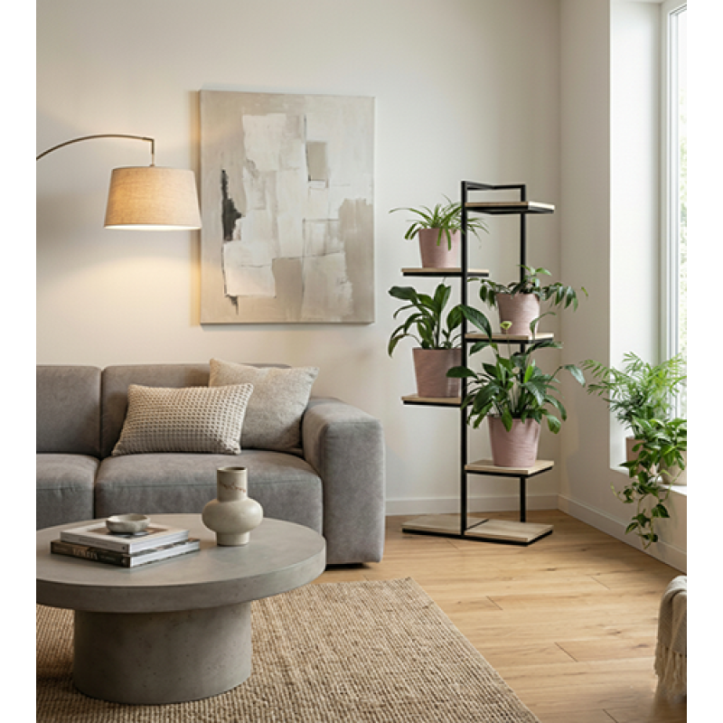 Підставка для квітів «Водоспад» від виробника UkrLoft — це ідеальне рішення для озеленення вашого простору. Ця модель поєднує в собі надійність металевої конструкції та естетику деревних текстур, дозволяючи створити справжній "зелений водоспад" у вашій кімнаті, офісі чи на балконі. Ця підлогова етажерка для квітів розроблена з думкою про довговічність та захист вашого інтер'єру: Основа виготовлена з металевого профілю 20×20 мм. Завдяки якісному порошковому покриттю, метал стійкий до подряпин, корозії та зберігає ідеальний вигляд роками. Використано ламіноване ДСП товщиною 16 мм. Матеріал легкий у догляді, стійкий до вологи та механічних пошкоджень. Підставка доступна у популярних кольорах, що пасують до будь-якого інтер'єру. Вертикальна конструкція висотою 160 см дозволяє розмістити велику кількість вазонів, займаючи мінімум місця на підлозі (всього 52 см завширшки). Це ідеальний вибір для зонування простору.