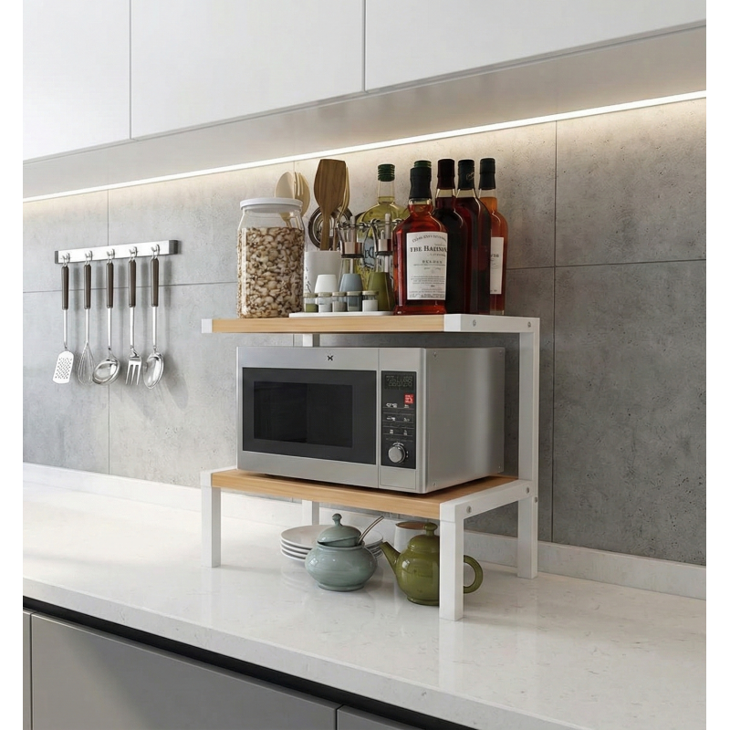 Оптимізуйте простір на вашій кухні за допомогою дворівневої підставки Rock-212. Це ідеальне рішення для організації робочої зони, що дозволяє зручно розмістити мікрохвильовку, посуд або спеції, не загромаджуючи стіл. Міцний металевий каркас із профілю 20×20 мм витримує значні навантаження. Біле порошкове фарбування не лише стильно виглядає, але й надійно захищає метал від іржі та подряпин. Дві полиці у популярному кольорі «Дуб Сонома» виготовлені з якісного ламінованого матеріалу. Вони стійкі до вологи, жиру та легко очищуються звичайною вологою серветкою. Ніжки обладнані спеціальними флісовими накладками, що гарантують стійкість підставки та захищають стільницю від подряпин під час переміщення. Завдяки продуманим розмірам (54 см ширина), етажерка вміщує більшість стандартних мікрохвильових печей.