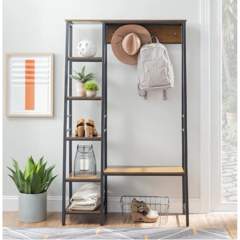 Ця передпокій змінить правила гри для під'їздів, які потребують додаткового місця для зберігання речей. Завдяки п'яти полицям і чотирьом гачкам він готовий утримувати ваші пальта, шарфи, капелюхи та сумки. А для ентузіастів шару є місце навіть для демонстрації однієї чи двох улюблених рослин.