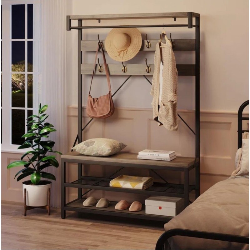Ця вішалка для одягу в передпокій виготовлена із високоякісного залізного металевого каркасу та дерева. Ідеальна інтеграція верхньої полиці, вішалки, підвісної стійки, гачків та лавки для зберігання взуття. Ви можете навести порядок у передпокої від одягу, сумок та парасольок, а також зберігати взуття та ящики для зберігання. Ви також можете розмістити зелені рослини на верхній полиці, щоб ваш простір виглядав яскравішим. Дозволяє зберігати багато в обмеженому просторі, підтримувати чистоту в будинку та економити простір.