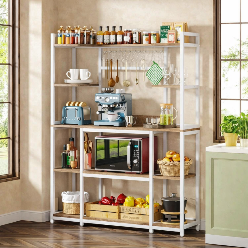 Цей 5-ярусний стелаж Скіф-2 має 140-метрову стільницю для приладів чи кавової станції. Насолоджуйтесь після обідньої кави серед улюбленої випічки! Міцна конструкція та 11 S-подібних гачків забезпечують багато місця для приладів, посуду, спецій та посуду. Ідеальне рішення для зберігання всіх потреб вашої кухні! Ідеально підійде для дому, офісу, магазину чи кафе. Легке складання, міцна конструкція та універсальний дизайн роблять його незамінним елементом інтер'єру. Додайте вишуканий стиль до вашого будинку. Матеріали -ДСП -16 мм та металевий каркас 20х40 мм.