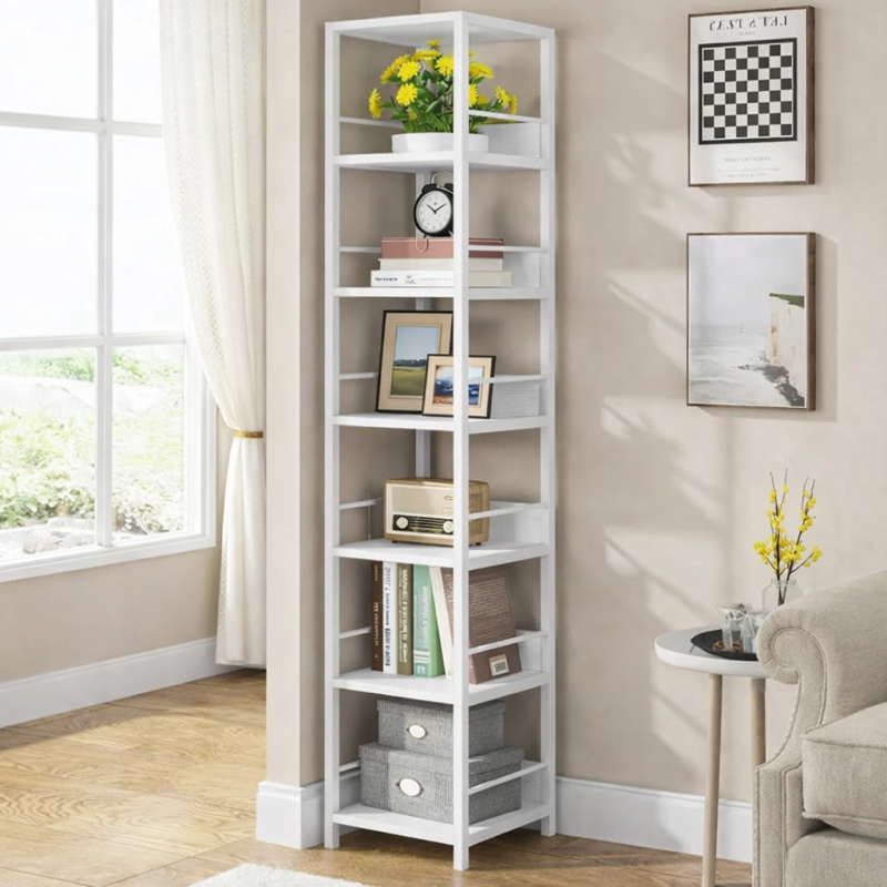 Стелаж оптимізує обмежені невеликі чи кутові простори. Він зручно поміститься у будь-якій кімнаті, включаючи гостину, кухню чи ванну, максимізуючи місце для зберігання, при цьому не займаючи надто багато місця.6-ярусний стелаж забезпечує достатньо місця для книг, рамок для картин, рослин тощо. Його конструкція включає задні перегородки та бічні огорожі, які запобігають падінню предметів, а верхня полиця пропонує додаткове місце для зберігання. Стелаж ефективно використовує будь-який маленький або кутовий простір у вашій кімнаті. Хоча він ідеально підходить як кутова полиця для зберігання, він також функціонує як книжковий шафа, полиця для вітрин, підставка для рослин або стелаж для зберігання на кухні. Ідеально підходить для компактних приміщень.