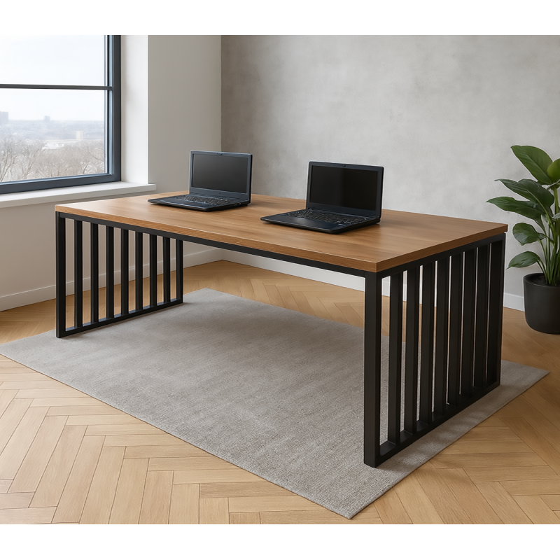 Офісний стіл забезпечує виняткову стабільність та довговічність зі стільницею, виготовленою з ДСП та металевої рами з порошковим покриттям. Велика стільниця надає достатньо місця для всіх основних речей, таких як ноутбуки, мобільні телефони, книги та файли. На стільниці можна зручно розмістити два комп'ютери одночасно. Великий розмір дозволяє двом людям працювати пліч-о-пліч. Маючи мінімалістичний стиль, стіл вільний від зайвих прикрас і відповідає вашим основним потребам. Накладка на ніжки, що регулюється, допомагає усунути коливання, забезпечуючи стабільність і запобігаючи подряпинам на підлозі.