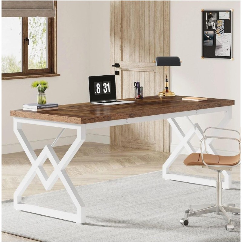 Просторий стіл забезпечує достатньо місця для ноутбуків, книг та канцелярського приладдя. Він також має багато місця для ніг. Цей універсальний стіл можна використовувати як великий комп'ютерний стіл, стіл для керівників або невеликий стіл для конференцій. Стіл має чарівний стиль, чорне покриття, чисті лінії та міцні металеві ніжки, що робить його придатним як для житлових, так і для професійних офісних приміщень. Його зварювальний трикутний дизайн надає додаткової стабільності.