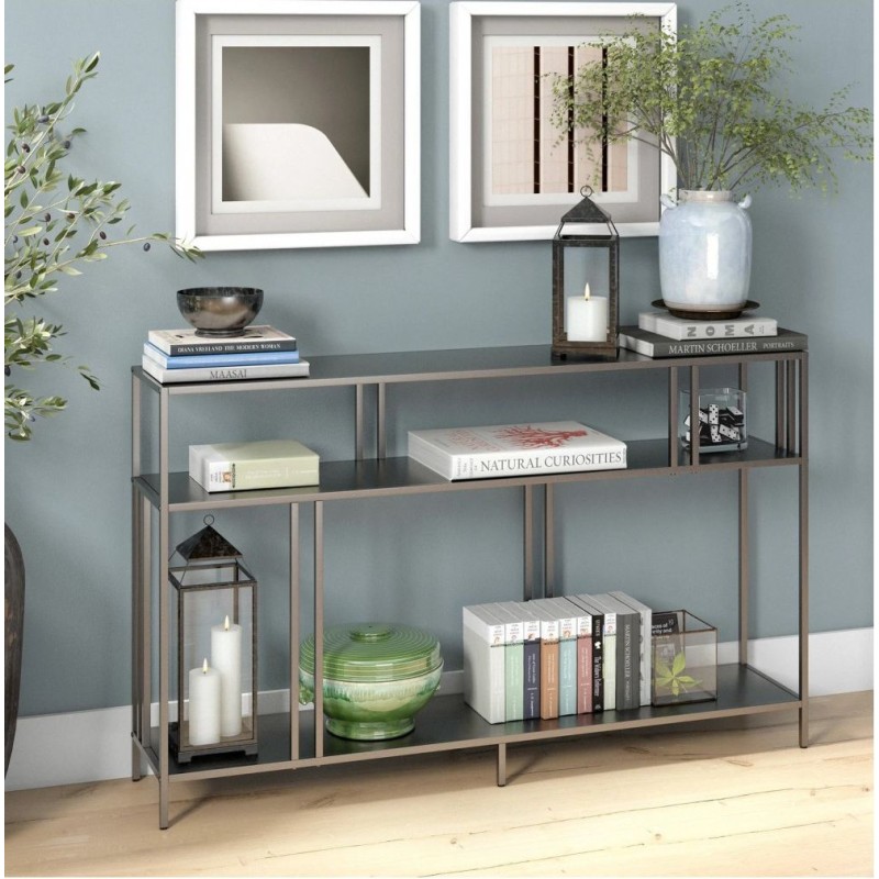 Консольний стіл Geneil створень для вузьких проходів та зон під зеркалом, де кожен сантиметр має значення. Глибина 25,5 см не заважає руху, а довжина 122 см дає простір для декору, ламп і органайзерів. Стільниця та поліці виконані з ДСП 16 мм — легко доглядається та витримує щоденні навантаження. За жорсткість відповідає рамний каркас із профільної труби 20×20 мм . Передбачено два проміжки: 15,5 см між верхом та першою поліцею та 46 см між нижньою та першою — зручно для кошиків, книг чи взуттєвих аксесуарів. Доступні чорний, білий, дуб сонома, дуб родос, горіх відтінки, які легко поєднати з лофтом, мінімалізмом або сканді. «Доставка по Україні» .
