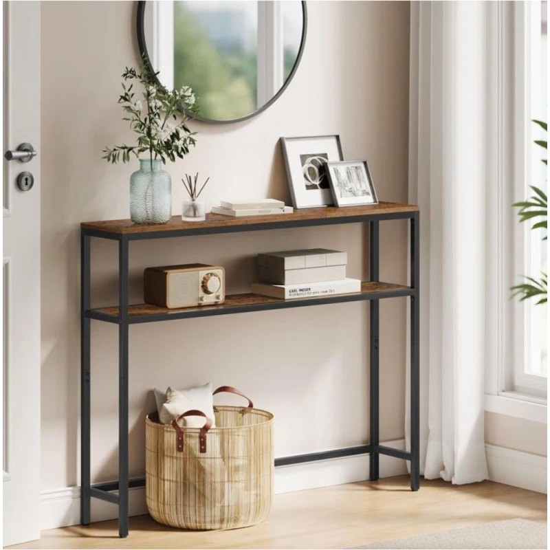 Консольний стіл Gerianna поєднує мінімалістичний силует та практичність для повсякденного використання. Завдяки глибині лише 20 см стіл не заважає проходу навіть у дуже вузьких коридорах, а довжина 120 см забезпечує простір для декору, лампи та органайзерів. Стільниця з ДСП 16 мм легко доглядається, стійка до побутових навантажень. Рамний каркас із профільної труби 20×20 мм гарантує жорсткість і стабільність конструкції. Висота 80 см зручна для розміщення під зеркалом у холі чи як консольний столик за диваном. Доступні чорний, білий, дуб сонома, дуб родос, горіх відтінки, що легко поєднати з інтер'єрами у стилі сканді, мінімалізм чи лофт. «Доставка по Україні» .