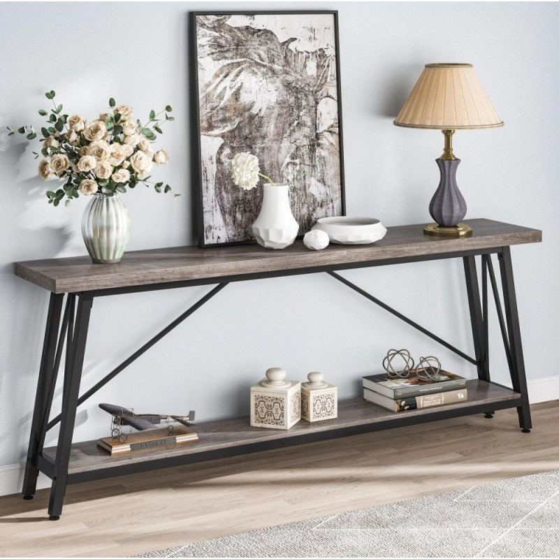 Класичний удлинений консольний стіл поєднує мінімалістичний вигляд та ежеденну функціональність. Верхня довга поверхня зручно тримає лампи, вазі, рамки та органайзери, а нижній ярус — книги, кошики та аксесуари. Формат 1800 мм завдовжки при 300 мм глибини залишається комфортним у вузьких проходах; висота 800 мм зручна для доступу та декорування. Основа – металевий каркас із профільної труби 20×40 мм , поліці – ДСП 16 мм у чорний, білий, дуб сонома, дуб родос, горіх кольорі. Трикутна структура підвищує жорсткість, а регульовані накладки на ніжки утримують консоль рівно і захищають покриття. Модель доречна як диванна консоль , акцент у передпокої або вузька етажерка у вітальні. Доставка по Україні, сервіс UkrLoft.