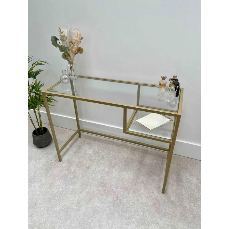Скляний журнальний столик у золотому відтінку додає інтер'єру відтінок гламуру та візуальної легкості. Верх і поліця виготовлені з прозрачного скла товщиною 6 мм , що підкреслює чистоту форм і полегшує догляд. Каркас із профільної труби 20×20 мм забезпечує жорсткість конструкції, а габарити 100×40×75 см зручні для вітальні, коридору чи зони біля зеркала. Додаткова скляна поліця дає місце для книжок, б'юті-боксів або декору (внутрішні розміри зони під поліцею орієнтовно 19×31×40 см). Доступна доставка по Україні.