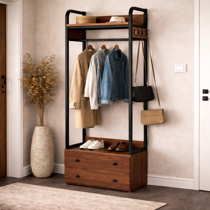 Вішалка для одягу з ящиками, гачками та полицями