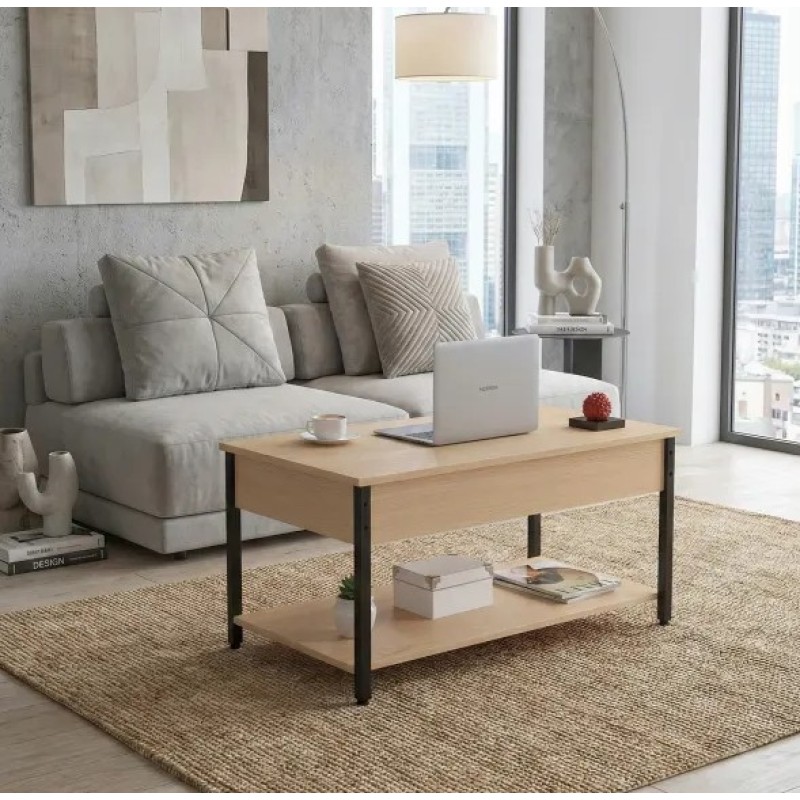 Журнальний столик L-5 - це універсальний та функціональний меблівий елемент, який адаптується під ваші потреби. Головна особливість — підйомна стільниця , що дозволяє перетворити столик на комфортне робоче місце або обідній стіл. Максимальна висота підйому — 675 мм , зі стільницею, що витримує навантаження до 10 кг . Матеріали високої якості: стільниця — ДСП товщиною 16 мм , ніжки — труба 20×20 мм у чорному кольорі. Прямокутна форма (95×54 см), глибина 54 см, стандартна висота 45 см у складеному стані. Є також відкрита нижня поліця для зберігання книг, пледів чи декору. Регульовані ніжки допоможуть вирівняти стіл на нерівній підлозі та захистити покриття. L-5 ідеальний для стилів лофт , мінімалізм , сучасний модерн , коли важливою є не лише естетика, а й практичність. Якщо потрібно працювати з ноутбуком чи споживати обід прямо з дивану – підйомний механізм дає таку можливість. Поверхні легко очищуються, металеві частини — стійкі до царапин.